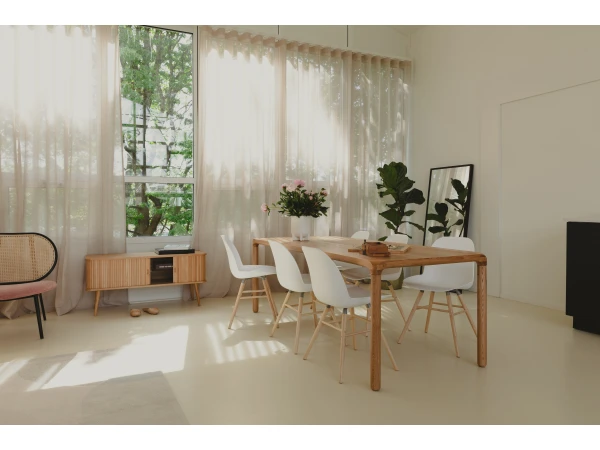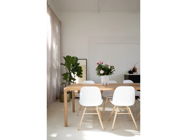 De schoonheid van tafel Storm van Zuiver zit hem in de details. Zoals de V-groef in het tafelblad en de afwerking van het tafelblad naar de poten.