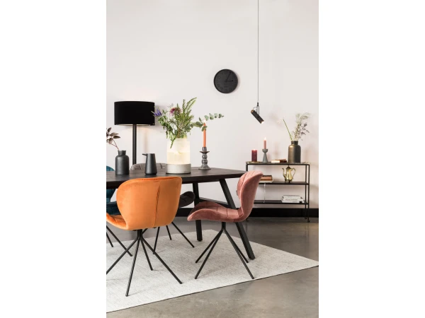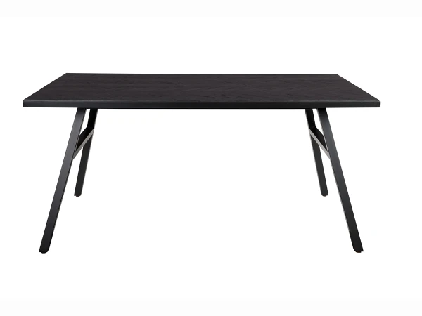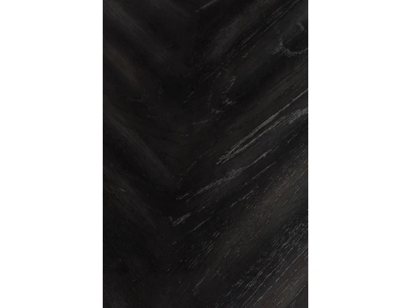 Eetkamertafel Seth typeert zich om zijn knap visgraatmotief en komt in 2 kleuren. De donkere versie heeft een meer industriële look, terwijl de eiken versie een feller contrast heeft met zijn onderstel. Met hun zwart metalen poten volgen ze steevast de laatste interieurtrends.